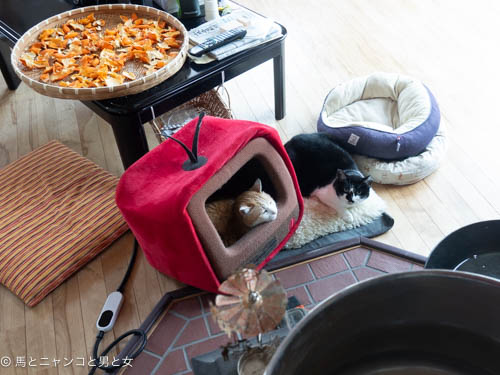 食べ終わったミカンの皮を薪ストーブ前で乾燥させているのは何の為かって?先日知ったんやけど薪ストーブの着火剤に使えるんよ。 めっちゃ燃える。