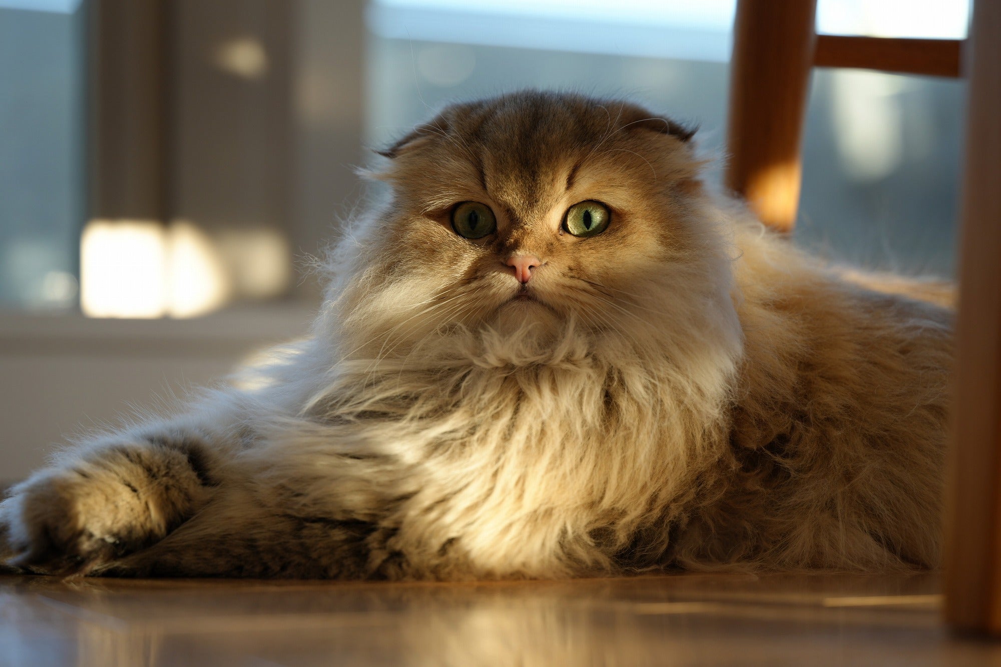 朝早く起きてYチェアの下にいるレオくん。 胸毛に朝日が当たって金色に輝きます。 体の位置をちょっと変えたら頬毛まで金色に輝きます。 レオくん、朝のひなたぼっこはどうですか? レオくん「床は冷たいけど顔はあったかいです。」 いつもより顔が立体的すぎて人相が違くなってますが、 もふもふな頬毛がますます立派に見えてます。 コロンママ「ドイツ皇帝のヴィルヘルム2世のカイゼル髭みたいですね~。」 レオくん「それってかっこいいんですか?」 コロンママ「かっこいいですよ。1歳には見えない貫禄ですね。」 レオくん「それならよかったです(`・ω・´)」 そう言ったレオくんはまぶしい朝日に目を細めるのでした。