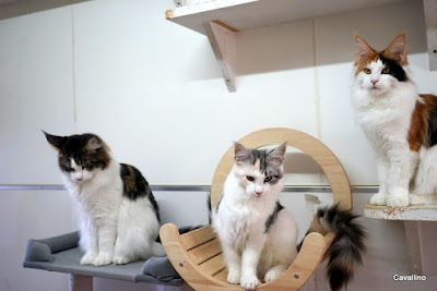 <はじめておいでの方へ>メインクーンキャッテリーCAVALLINOへようこそ。日々の出来事や子猫情報などを綴っています。大家族ですので、わが家の家族紹介No.1とNo.2をご覧下さい。ペトハピ 太鼓判ブリーダー に掲載されました。クリックすると見られます。新しくメンバーが増える時、どうやってみんなに馴染んでもらうかは頭が痛い。最初が肝心だから。今回は生後6か月の子だから、大丈夫かなあって。いつもは1歳になる子ばかりだったから、最初は顔が見えるだけにして・・・・・なんて。最初にもめちゃうと後までそれを引きずる。そうはなって欲しくないから。はい、もうすでに普通に家族になっております。数日はシャーって言っていたけれど、この部屋のメンバーは穏やかで「売られたケンカは買わない」「見ないふり」をする子たちばかり。アメちゃんなんて怒ったのを見た事がない。その娘のフレイヤも同じ。恐がりのリュリュも猫は平気。その中でも一番見直したのが・・・・サル・・・・じゃなくて、ラーラ。陽気で遊び好き。新しく遊び相手が来て嬉しかったらしい。文句を言われたってへっちゃらで、あっちこっちを案内して歩いていた。ラーラ、落ち着きがなくてやんちゃ。でも見直したよ。いい所あるじゃない。 ランキングに参加しています。バナーを2つポチッと押していただけ