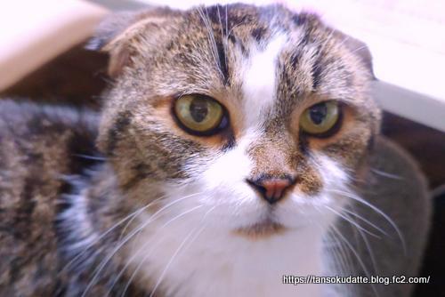 主が寝室に行く前、レオンは膝の上に乗っている。最近、毎晩こうして甘えているツッチー。年を取ってからのほうが甘えん坊になった。膝に乗っている間、ずっとゴロゴロ言っている。↓Youtubeショート動画膝の上でずっとゴロゴロ言っているレオンがかわいいです😍夜、主が寝室に行ってしまうと、ルナが豹変!突然活発に!自分でターゲットを決めて走り回っているようだ。監視カメラでないと見られない光景!テーブルの上に置いてある物をかじっている!リモコンでカメラを動かしたら、気付いたのか?動きを止めて、少し警戒している?そのうちにラムも動き出して。何しようとしてるんだろう?ツッチーも巻き込まれそうだ。別角度から見ても、やっぱり走っていたルナでした。昼間のルナちゃん。コンデジで撮ったら、目の色がスゴイ緑色!昼間は相変わらず大人しくて動かない。↓Youtube動画ツッチーのゴロゴロが聞こえるよう、BGMを消して近づいてみました。爆音のゴロゴロ、聞こえるでしょうか?ちかづいすぎて、顔が怖いけど、かなり甘えているツッチーです!気まぐれなので、たまに噛みついてくるけど甘えるツッチーが可愛くてしかたありません😍夜中走り回っていたルナと昼間のルナは大違いだ。ツッチーも昼間はほとんど甘えに来ない。夜と昼の顔がぜんぜん違う猫たちなのでした。