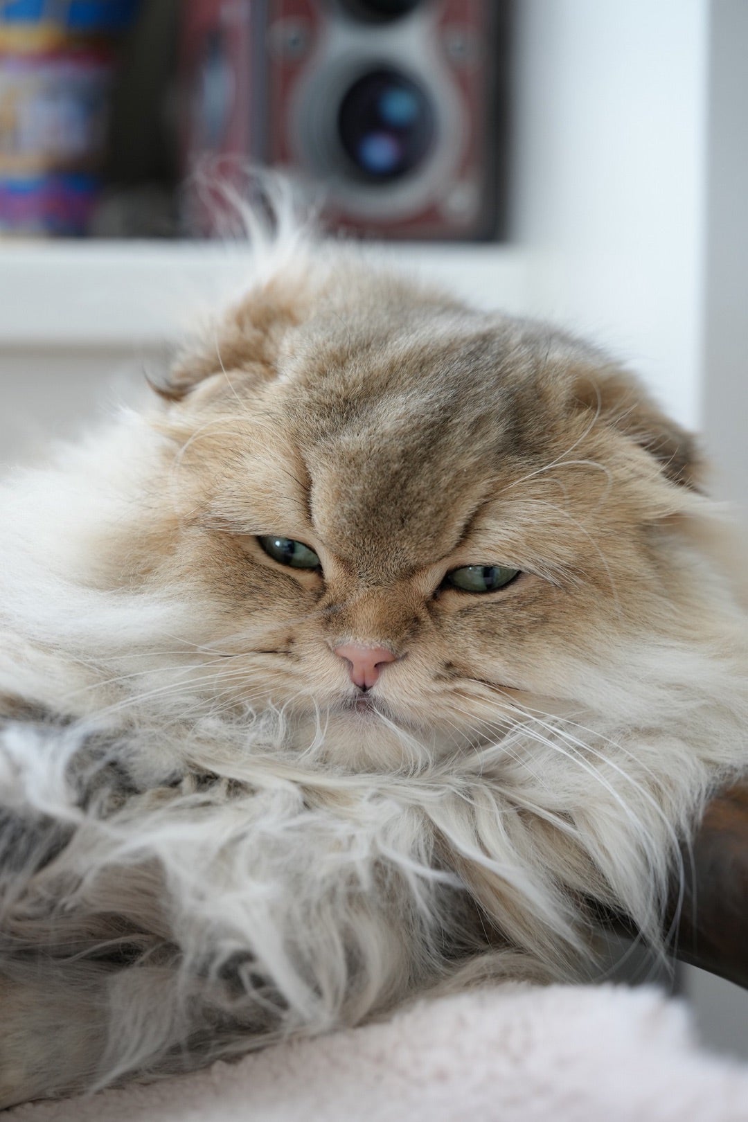 静電気で頭と胸毛があっちこっちに向いてるレオくん。 コロンママ「なでなでして毛流れを整えましょう。」 頬毛をギュッとしたら小顔になったレオくんは、 牙がチラッと見えちゃっていたずらっ子みたいな顔になっちゃいます。 少しは毛流れが整ったかなと思ったら、 ? もわぁ~んとしたあくびが出ちゃいます。 そしてコロンと横になります。 いつのまにか反対向きになって寝ちゃってるレオくんは、 またまた頬毛と胸毛が静電気でもわっとしちゃうのでした。