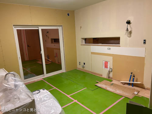 壁紙剥がして石膏ボードを取り替え断熱&気密アップの作業を終え昨日壁紙を貼ってもらった。一部屋の荷物を移動して狭くなったリビングで不貞腐れてるマーボー。