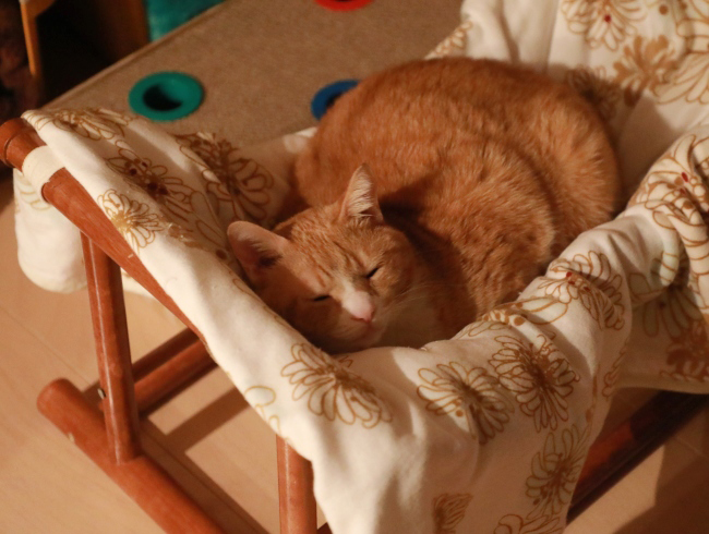 あったかい日はへそ天で寝ているお下がりハンモックに埋もれてうとうと。寒くないかな?リビングで寝ていることの多いユウの寝姿を見て床暖房の温度を微調整。ハンモックより床に近いお下がりキャリーの毛布でちんまり寝ようとしていたのでほんのちょっと温度を上げたら毛布と一緒に