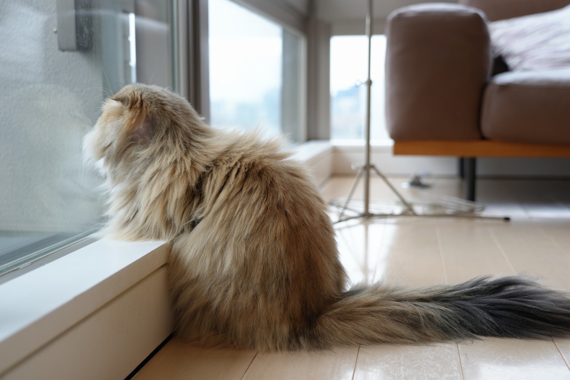もふもふ猫背でベランダを見てるレオくんは、 ちょっぴり(どころじゃなく)汚れた窓に顔が映ってます。 レオくん「きょうは東京でも雪が降るっていうから待ってます。」 コロンママ「お天気アプリによると午後から降りそうですけど、もしかしたらみぞれ程度かもしれませんね。」 レオくん「ふ~ん、そうですか。ぼくは雪がいいです。」 そう言って窓辺にべったりなレオくんは、 う、うん? あれれ??? ついに特大毛玉が取れてクレーターみたいな特大ハゲになってます。 レオくん「ちょっと首がスースーするけど大丈夫です。」 コロンママ「いま敵に襲われて噛みつかれたら一発でアウトなハゲ具合ですね~。」 でも本人はほとんど気にしてない、特大ハゲのレオくんです。