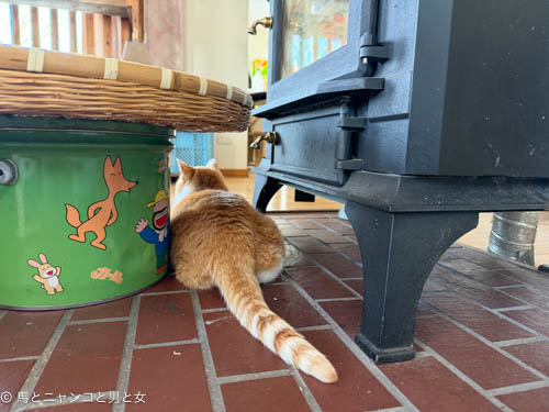 ねこ画像「まっちゃん」が薪ストーブと灰入れバケツの間に陣取ってるんやけど着火剤にするミカンの皮とオヤツ用のカボチャを干してるカゴの下・・・ここに置いとくと薪ストーブの熱でカラッカラに乾いてくれる。