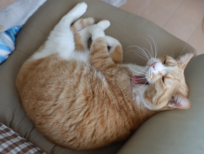 ソファでは私の席の座布団で寝ているユウ。近寄っても席は譲ってくれず座りたいなら抱っこして、ってな感じで