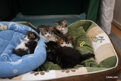 <はじめておいでの方へ>メインクーンキャッテリーCAVALLINOへようこそ。日々の出来事や子猫情報などを綴っています。大家族ですので、わが家の家族紹介No.1とNo.2をご覧下さい。ペトハピ 太鼓判ブリーダー に掲載されました。クリックすると見られます。昨日の問題の正解です。なんだか一人黒っぽい子が増えていませんか?ぱっかんの子です。踏まれてしまいそうなので、お引越しを。エスカーダっ子より1週間以上後に生まれたので、一緒にしてどうなるか悩みました。もう、究極の選択でした。しかし、この坊ちゃん、何かおかしくないですか?子猫の1週間ってすごく差が出るはずなのに・・・・巨大児なのです。何度も言います。この子は残りの子より1週間以上後の生まれ。そう思って見ると・・・・・なんだか変ですよねえ。動きは他の子と比べてまだ「よろよろ」でも、体重は・・・・負けていない。エスカーダも違和感なく受け入れてくれました。頑張れ坊ちゃん。 ランキングに参加しています。バナーを2つポチッと押していただけると嬉しいです。頂いたコメントは楽しく拝見させていただいております。ブログを書く励みになっていますが、個別にお返事するのをお休みさせてもらっています。それでもいいよ、という方コメントをぜひお願いいたします。初めての方もご遠