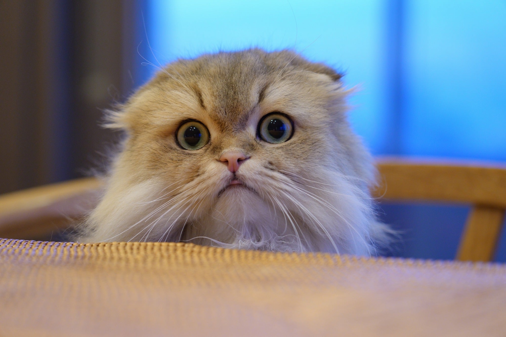 テーブルの向こうからぴょこんと頭を出してるレオくんは、 長く伸びた頬毛を見せてから、 堂々とテーブルの上に乗ってドヤ顔です。 レオくん「お空が深い青で綺麗だからここにいるんです。」 コロンママ「夕方のブルーアワーですね。レオくんは青が似合うからぴったりです。」 レオくん「似合ってますか?」 コロンママ「似合ってますよ」 レオくん「よかったです。」 青で映えてるレオくんはますます堂々とするのでした。