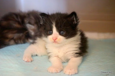 <はじめておいでの方へ>メインクーンキャッテリーCAVALLINOへようこそ。日々の出来事や子猫情報などを綴っています。大家族ですので、わが家の家族紹介No.1とNo.2をご覧下さい。ペトハピ 太鼓判ブリーダー に掲載されました。クリックすると見られます。しじみとぽっくんの子たちの写真を撮ってみました。みんな一緒だと子猫ジグゾー状態になっちゃうから。生後4週間弱です。しかし、けっこう難しい。まだおもちゃには反応しないし・・・・ふるふる揺れているし(笑)ブラック&ホワイトの男の子目が悪くなって、撮れたと思っても・・・・ボケボケ。シルバータビー&ホワイトの男の子シルバーパッチ&ホワイトの女の子鼻の柄が(笑)もう一人のシルバーパッチ&ホワイト小さく生まれたのにぐんぐん成長して並びました。スモークキャリコ(?)の女の子ちょっと変わったカラーです。一番個性的なのが・・・・・キャリコ(三毛)の女の子。みんな頑張って滞在許可をもらおうね。dinoのつぶやきキャリコの子は一番に生まれた。でも、頭が出かかったところで引っかかってしまった。どうにかしないと死んでしまう。焦っていた時に目に焼き付いたのが、おでこにあるレッドの模様。それが見えていたんです。女の子たちはみんなぽっくんから赤い毛をもらう。ぽっくんに「ボクの子を助けて」って言われたようで。無事引っ張り出