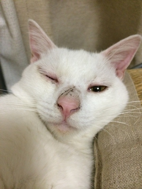 現在、終末期と言って差し支えない麿白。その保護直後と見比べると、あんまり変わってません。血色や毛並みはもちろんそうなんですけど、顔がもうずっとこのままなんですね。幼いはずなのに既に顔はオトナだったヤングマロちゃん。この頃は猫風邪とコクシジウム両方にやられてたので表情に精細がないのが今とよく似ている理由でもありますね。そして鼻の傷とおでこのマロ眉。鼻の傷は明らかに猫に引っ掻かれたものですが誰にやられたんでしょうかね。そして鼻の傷で済んだのが幸運でした。正面からだと目力もあるヤングマロちゃん。目つきが特徴的で、ゆえにメスだろうとしばらく思い込んでました。コクシジウムの影響で肛門周辺が腫れ上がっていて性別が判別不能だったのです。腫れが引いてから「あれ、これωじゃん」となったのでした。そんな昔話をしつつ。明日もまた病院に行ってきます。