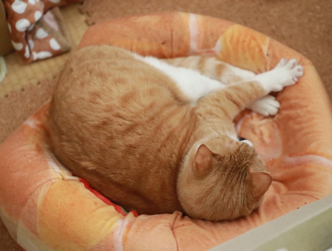 すぐそばに置いたパンケーキベッドは隠れ家としても便利でこたつに入ったりパンケーキに入ったり。昨日は暑かったのでつぶして乗って寝たい気分だったもよう。以前はつぶすと自分では元に戻せずに下僕をにゃーにゃー呼んでいましたが