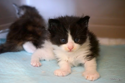 <はじめておいでの方へ>メインクーンキャッテリーCAVALLINOへようこそ。日々の出来事や子猫情報などを綴っています。大家族ですので、わが家の家族紹介No.1とNo.2をご覧下さい。ペトハピ 太鼓判ブリーダー に掲載されました。クリックすると見られます。ぽっくんとしじみの子たち、無事に生後1か月を迎えました。写真は1か月になる少し前のものです。ブラック&ホワイトの男の子スモークキャリコ(スモークトーティー&ホワイト?)女の子です。三毛柄は全部女の子です。シルバーパッチ&ホワイトの女の子もう一人いるんですが、これがよく動いて写真が撮れない。えいっ!!捕まえて・・・・・「ヤ~メ~テ~」小さく生まれた子ですが、追いついて追い越し始めました。そして、カメラがピント合わせに困るこのお方・・・キャリコの女の子いちばんの食いしん坊。シルバー&ホワイトの男の子。エスカーダっ子と比べると小さく感じてしまう。あっちは毛がモコモコ。こっちはみんな細マッチョ。比べちゃいけない。しじみの方が1.5倍の子を育てているんだものね。4と6の違いって大きいかも。誰も欠けずに育ってくれて感謝です。神様、この世の滞在許可を早めにお願いいたします。 ランキングに参加しています。バナーを2つポチッと押していただけると嬉しいです。頂いたコメントは