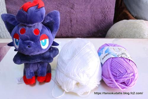 またまたぬいぐるみの服を編みますよ~。先日も作ったゾロアのぬいぐるみに、クロバットの被り物を編んでくれとリクエスト。この写真だけ見て再現しようという、やや無謀な企み。鎖編みで顔周りの長さに編んで輪にします。2段目から編み方はすべて細編み。臨機応変に形を見ながら編んでいきます。ここで鎖編みを入れて、頭の後ろ側と輪にします。↓Youtubeショート動画昨今の推し活ブーム、推しのぬいぐるみに衣装を着せたいという要望に応え、かぎ針編みで編んでみました!まだ数段しか編んでませんが、ラムが様子を見に来て動かなくなりました。甘えたいのか手にスリスリして邪魔してきます。耳の部分を残して、頭頂部を前から後ろに繋ぐように編みます。前回の被り物の時と、編み方を変えます!前回は先に耳を編んでから頭頂部を足しましたが、なんかパンツを被っているみたいな形ですが…wwwこのほうが形が決めやすいようです。長さが編めたので、引き抜き編みで前後を綴じます。はい、パンツができあがりました!耳部分は先細りになるよう、1段で2目ずつぐらい減らし目します。耳先まで13段編みました。両耳を同じように編みます。こんなふうになりました。首から下の部分、1段目は増減なく細編み。ギザギザのマントになるように、細編みで三角に編んでいき、三角を縁取るように細編みで降りてきて次の三角を。三角を3つ作って、その周りを縁取るように細編みしました