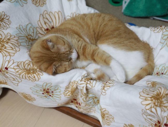 コンパクトな寝姿で眠るユウ。あったかい時はへそ天で寝ているので