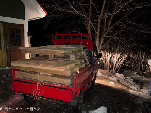 何も載せずに帰るのは惜しいので木製パレットを5枚いただいてきた。バラして薪にしようかと思ったけどあまりにきれいなんで保管し