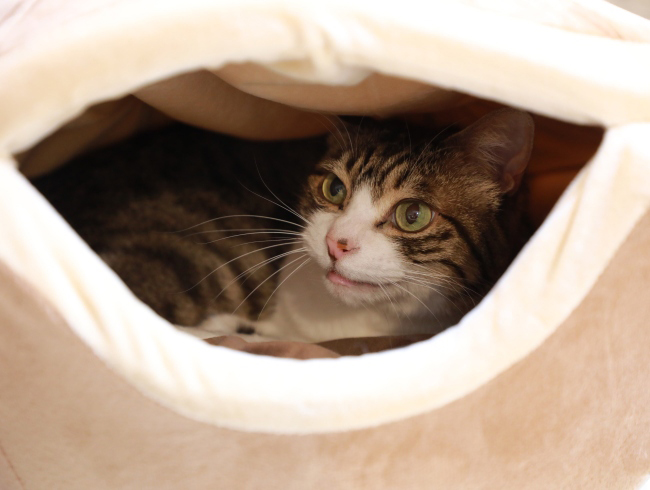 閉じ込められるのを不安に感じるのかどら焼きに入らなくなり現在はすっかりこちら。うらやましがりでアミ姐さんのニオイ好きのユウなのにアミお気に入りのテントベッドはなぜか、最近はつぶさなくなり借りに来たりもしていない様子。テントベッドに仕込んであるホットカーペットも