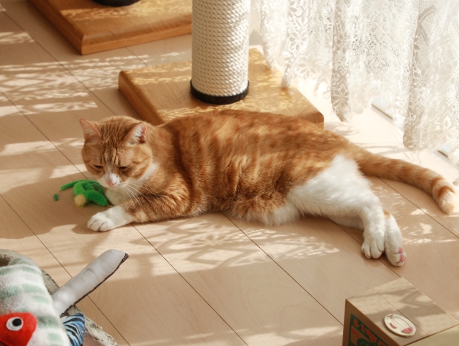 よく晴れて暖かい朝。カーテンを開けたらこんなユウ。状況から察するにオモチャ入れからオモチャを選びひとり遊びをした後