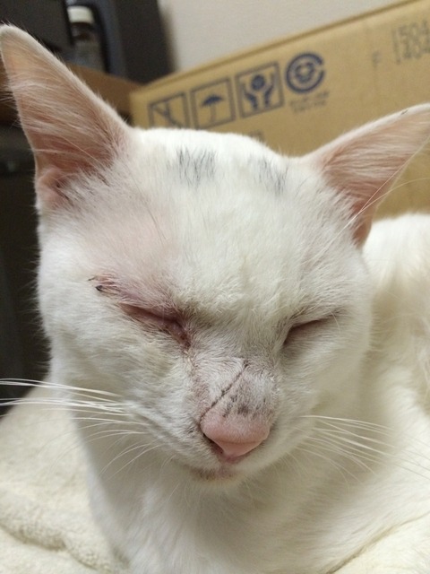 麿白をずっと「ミスター珍妙」「ウチューネコ」と呼んでたわけですが、衰弱してたこともあり最初の一週間はキャラを掴めずにいました。そんな中で見つけた鼻の引っ掻き傷もまだ鮮やかな保護三日目のこの顔。まんま遺憾の意の顔じゃないですか。どういうことなのか。たぶんこの時は「具合が悪いんだろうな、可哀想に」くらいに思っていたはずです。なんだい、ひとが具合が悪いのに、極めて遺憾だね。実際、具合は悪かったからこういう顔だったんだと思いますけど。ていうか具合が悪いからってこういう顔を猫はしないのではないか。一方でこうして添い寝顔。マロ眉がなかったらいつの画像か区別がつかないと思います。もちろん、この頃はまだまだ体も小さいのですけども。なんだい、上から撮るなんて極めて遺憾だね。まだこの時は認識が「可哀想な子猫」だったのに、内心は遺憾だったのか。それもこうして振り返ってからわかるのでした。ぼくを離さないでおくれよ。その訴えも確かで、それはこちらにも伝わってきたのでした。