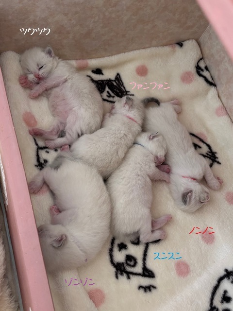 こりゃるっ子達🎵活発になってきてもう育児箱から脱走しそう(;'∀')(シエルパパ撮影)こりゃるちゃんは相変わらずこだわりがありトイレと水飲みは一階に行ってます。こりゃるちゃんが休憩から帰ってきたら子猫達むらがる。飲み終わると爆睡💤ノンノンの寝方(笑)・‥…━━━☆・‥…━━━☆・‥…━━━☆・‥…━━━☆上から撮影してるのでうまく撮影できてないけど生まれた順に。*スンスン**ノンノン**ゾンゾン**ファンファン**ツクツク*今回の子達は全にゃん、はなぴん大好物のリンクスバイカラーです✨みんにゃ、めっちゃ可愛いんですよー💛・‥…━━━☆・‥…━━━☆・‥…━━━☆・‥…━━━☆日曜日から絶不調のあっちゃん。昨夜からああみ催促をしてくれるように。朝も何回も催促に。ちょっと良くなってきたのかな。でも体重はちょっと減った(´;ω;`)ウッ…吐き気がなくなってきたようなので少しでもいいから増えてほしい~~。☆;+;。・゚・。;+;☆;+;。・゚・。;+;☆;+;。・゚・。;+;☆;+;。・゚・。;+;☆昨晩、動画に夢中になってるれおん君。モネちゃんもよく見てたよね~。モネちゃんに会いたいなぁ。朝のまぼちゃん。素敵♡オルくんとろぜちゃんは今日も仲良し♡おまけのオルくん。ほーにゃんの箱入り息子です✨訪問ありがとうございま
