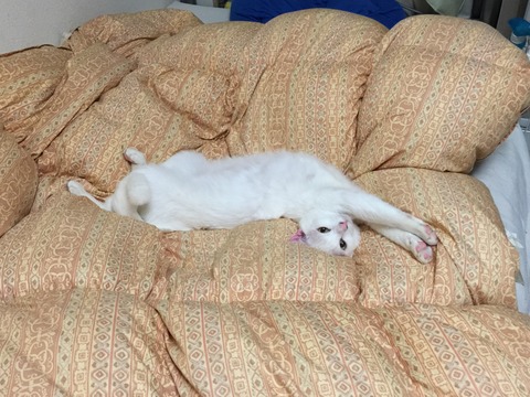 晩年はほぼホットカーペット付近にいた麿白ですが、一番好きだったのは羽毛布団でした。ふむ、実にふかふかで気持ちがいいね。羽毛布団の下に布団乾燥機の温風を入れるのが好きだったようです。布団乾燥機も確かそういう目的で買ったはずが、猫シャンプーのドライヤーになりました。寝てよし伸びてよしだね。ぼくもふかふかだよ。甘える時やくつろぐ時は羽毛布団大活躍、しかし難点がありました。当然ですが羽毛布団の上では遊ぶことができません。なのでこうして剥がす必要がありました。そういう時も下のマットレスとシーツの間に布団乾燥機の温風を入れると麿白がウチューツチノコになりました。羽毛布団がない時はこうして間に挟まるヤング麿白。次元の裂け目で通信するのだよ。なんで羽毛布団を敷かなくなったかというと嘔吐されたからです。確か、2017年くらいまではこちらの居間でも羽毛布団だったはず。麿白と参瑚がとにかく嘔吐体質だったんですね。参瑚は秋冬になると胃腸の動きが悪くなり便秘に陥り、食べてはマーライオンになるのが2019年頃までの恒例でした。布団やマットレスの上で吐かれるのは当然でもあり、布団も消耗品と割り切らねばなりません。なおマットレスは二重にベッドカバーをかけており、これも消耗品と割り切ってます。