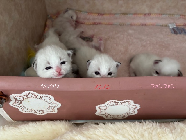 昨日の子猫達。起きてる時は出てくる勢い(;'∀')奥で寝てるのはスンスンとゾンゾン。引いて撮影するとこんな感じ。みんにゃ、大きくなってきたから育児箱が狭くなってきた・・・拡張しないとダメだなぁ。朝、こりゃるちゃんが育児箱に入ると子猫達むらがる。その様子を近くで見守って・・・・ないオルくん(゚Д゚;)寝てるや~んヽ( ̄д ̄;)ノ男の子達は第二回目開催中です。・‥…━━━☆・‥…━━━☆・‥…━━━☆・‥…━━━☆*スンスン**ノンノン**ゾンゾン**ファンファン**ツクツク*子猫達、お顔がもっふりしてきたのでゴムが見えない・・撮影してる時はわかるんだけどあとから見返すとゴムが見えなくて「誰?」状態( ̄▽ ̄;)太いカラーゴム必要だな(~_~;)・‥…━━━☆・‥…━━━☆・‥…━━━☆・‥…━━━☆あっちゃん。結局昨日は、体重が少し増えて嘔吐もしてなかったので病院にいくのをやめました。食べてくれてはいるけど前と比べると少量。これから体重が減るようであれば来週病院かな。おまけの足ピーンほっぺたんと落下防止網の上のオルくん。即回収です!!!訪問ありがとうございます♪ポチっと応援クリックお願いします(*´▽`*)↓にほんブログ村ちびまぼ・ちびあっちゃん・ちびベル