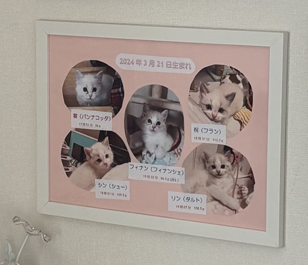 今日はこりゃるちゃん初めての子達のお誕生日です✨うたはふ・シンリン・フィナンお誕生日おめでとう~~~~+゚。*(*´∀`*)*。゚+みんにゃのパパのまれっちくん。赤ニャンのお世話したくてウズウズしてるけど子煩悩すぎて子猫を運んじゃうので会わせられません。子育て奮闘中のみんにゃのママ、こりゃるちゃん。頑張ってくれてます✨うたはふ・シンリンの弟のフィナンくん。今日も運び屋ふぃふぃしてます。相変らず心の狭い男です(笑)オルくんに厳しいんだよね~。今回生まれた子達には優しくしてほしいな~。☆;+;。・゚・。;+;☆;+;。・゚・。;+;☆;+;。・゚・。;+;☆;+;。・゚・。;+;☆昨日のお乳タイム。こんな体勢でも飲めるようになりました。おなかいっぱいで寝てる5兄弟+ユニコーン6兄弟みたい笑このあとのお乳タイムでは子猫達が集まり過ぎて動けないこりゃるちゃん。これで飲めてるのがすごい。飲み終わった子猫達。ノンノンとスンスンが抱き合ってる。はなぴん脳内ではノンノン「いつもひっかいてごめんね」すんすん「大丈夫だよ」という会話が流れました(笑)そして、まだ暗い朝方。昨晩はみんにゃ育児箱にはいってもらったのに3にゃん脱走してた(゚Д゚;)(こりゃるちゃんは、缶詰がたべたくて催促の為走ってきました)はなぴんが子猫を起こさないようそーっとこりゃるちゃんのご飯を用意してると足