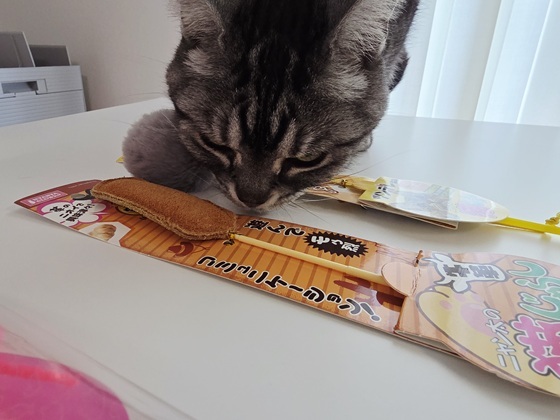 セレブレーションバッグに入っていた、皮のじゃらし。めっちゃ嗅いでたから、遊ぶかなーと思ってたのに、この後、ダッシュで逃げた。そんなに、グイグイやってないよ?お次は、リリララ。めっちゃ嗅ぐ。ララは、遊んでくれた。楽しそう。だけど、リリは・・興味ナシ。ファーストインプレッションは、ララだけだなぁ。シチュエーションを変えて、またチャレンジしよう。あめにも。