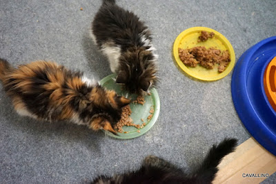 <はじめておいでの方へ>メインクーンキャッテリーCAVALLINOへようこそ。日々の出来事や子猫情報などを綴っています。大家族ですので、わが家の家族紹介No.1とNo.2をご覧下さい。ペトハピ 太鼓判ブリーダー に掲載されました。クリックすると見られます。休んでいたウサギさんが動き出した?古城と紅映はウエットだったらよく食べるようになりました。dino家のかかりつけの獣医さんはウエットをあんまりやるなっていう方針。お腹を壊しやすいっていう理由で。今はウエットとドライを組み合わせて与えるのが主流なんだけれどなあとは思いますが。その獣医さんが「好きに食べさせていい」と。食べなきゃ成長しないから。ちびさんたちの勝ち~(笑)「アッチニモアル」ふやかしご飯です。「スンスン・・・」あ・・・・・「ヤッパリコッチ」混ぜ混ぜはダメか。必死で食べております。ウエットの方がカロリーは低い。カリカリも食べてほしいけれど、そうも言っていられない。「ウマウマ」お腹もやっと落ち着いて、ワクチンを打つことができました。ゆっくり減った体重を戻していこう。本日のお・ま・け♪2人が必死で食べている同じ時・・・・・「ナンダコレ~!」鶯宿はdinoのジャケットと戦っておりました。ウエットは嫌いじゃないけれど、そんなに量はいらないそうです。いちばんでっかくなっています。