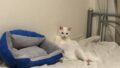 リビングの大箱の中の寝床はほぼユウ専用に。床暖房の熱を逃さない寒がりさん向けの仕様のため暑くなると足、にょっきり。(二度見しました)暑くなり過ぎたら大好きな加湿器前へ移動して