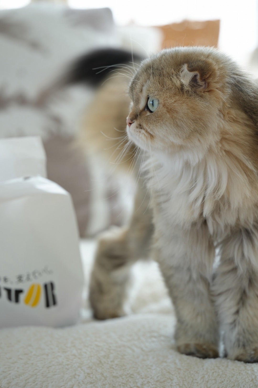 ちょっとずつ毛が伸びてきたレオくんと白い袋。 レオくん「なんの袋かな?」 コロンママ「ドトールで買ってきたものが入ってますよ。」 コロンママ「ドリップカフェのカフェインともっちり桜どら焼き、コーヒー羊羹です」 ピンクと黄緑がとっても春っぽいパッケージで気になるので、 まずはもっちり桜どら焼きから見てみましょうか。 レオくん「全然ピンクじゃないです。」 コロンママ「ほほほ、どら焼きだから外側は茶色ですね~。」 それでもそっと近づいて匂いチェックするレオくん。 コロンママ「真っ二つに斬ったら中に桜あん入りのよもぎ大福が入ってますよ。」 レオくん「おいしそうです♡」 ほんのり桜のかほりがする香ばしいかほりにペロリン。 コロンママ「コーヒー羊羹もあるので見てみましょう。」 コーヒーとあんこって合うんでしょうか??? 中身はちょっと色が濃いめですが普通のミニ羊羹ですね。 レオくんは至近距離で、ふん