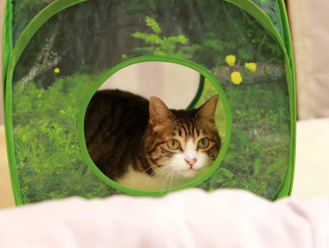 オモチャを持参するとテントで待機。テントで息を潜めて獲物の動きをじーっと観察するハンターアミ。この日の獲物はお下がりのフェイク・やんま。