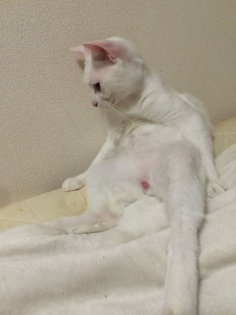 ・第7回推し猫グランプリの投票が始まりました。投票は5月7日までになります。みなさまの清き一票を何卒よろしくお願いいたします!・SUZURIの「SUZURIクリエイター100万人感謝セール」4月13日21時前まで開催中です。何点か追加しましたのでこの機会にぜひよろしくお願いいたします。さて、なぜ麿白を単独時代によく遊ばせてたのだろうというのをこれを見るまですっかり忘れてました。すわ、ミョウガ⁉︎とセンシティブに見えますが、これは舐め壊しで皮膚が見えてしまった所です。グルーミングし過ぎというのをやはり気にしてたり病院に相談したりで色々と対策をしてる中で、とにかく遊ばせてみるというのをやってたからだったのを思い出しました。2014年夏はお腹がだいぶ薄くなり、一部は上のような完全舐め壊しでした。固いエリザベスは拒否、というか現実的ではなく。噛むおやつやおもちゃを導入しても食いつきはイマイチ。そこで遊び足りない故の転嫁行動ではないかと遊ばせて疲れさせる方向で試みてたのでした。遊ぶ分には全部食いつくので過剰に遊んでたヤング麿白。その結果、こうしてバテたわけです。この当時はそこまで心臓も腎臓も弱いとは知る由もなく。普通の猫ならほどほどでやめると思うのですが。琥麦も遊ぶ時は休み休みで体力を考えてます。麿白は一直線でした。おかしいね、ウチューでは縦横無尽だったのだけどね。過剰グルーミ