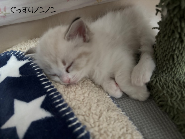 朝、写真撮影しようと思ったらノンノンがぐっすり💤一緒に部屋に入って来たオルくんテンションダウン(笑)わかりやすい男だ。4にゃんは元気いっぱいで運動会してます。おもちゃで遊んだり戦ったり。はなぴんの所にも遊ぼう~ってきます。ってか、狙われてる(笑)4にゃんが走り回ってるから強制的に起こされるノンノン。起きてすぐに「抱っこ~」って来たんだけどまたまた強制的に遊びに付き合わされる(;'∀')毎日こんな感じで写真撮りながら子猫達が眠るのをまってからブログ更新してます(*´▽`*)・‥…━━━☆・‥…━━━☆・‥…━━━☆・‥…━━━☆☆スンスン☆☆ノンノン☆☆ゾンゾン☆☆ファンファン☆☆ツクツク☆・‥…━━━☆・‥…━━━☆・‥…━━━☆・‥…━━━☆今日は曇り。ちょっと寒くてストーブをつけてます。今朝も3時すぎに起こされ・・・なんだかんだしてたら5時近かったのでそのまま起きてるはなぴん・・・・(=_=)☆遊んでるれおん☆テレビに映ってるれおんと手を合わせてハイタッチしてるみたいでしょ(*´▽`*)訪問ありがとうございます♪ポチっと応援クリックお願いします(*´▽`*)↓にほんブログ村ほぺれおろぜ♬