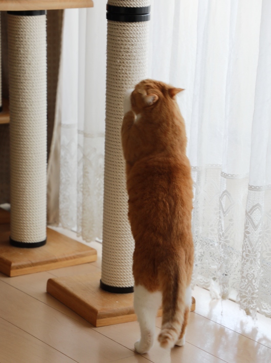 ちびっ子時代から木登りをしているキャットタワーの柱。