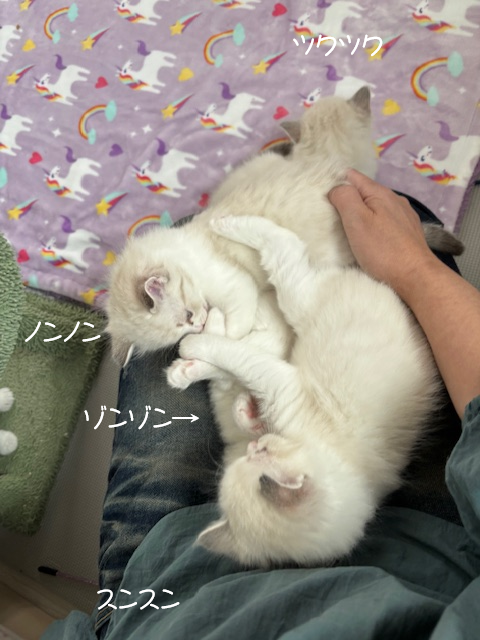 昨日の朝、膝に群がる子猫達をおろして(この時、ファンファンはキャットタワーで寝てました)はなぴんは病院へ行ってきました。帰ってきたのは午後2時・・・疲れた💦子猫部屋に入るとお膝にくる子猫達。ふと、横を見ると荒れてるわ~~~(;'∀')誰だ?犯にゃんは???昨日は9時半から14時までお留守番だったんだけどお昼によーにゃんが部屋に行ったらみんにゃ寝てたそうです。怪我なくいい子でお留守番できてよかった。今朝の子猫達。朝から運動会。走ってたツクツクが育児箱に入り並べたぬいぐるみ達で遊びだした・・・犯にゃんはツクツクだな~~~(*´▽`*)・‥…━━━☆・‥…━━━☆・‥…━━━☆・‥…━━━☆☆スンスン☆スンスンとノンノンの可愛い2ショットなので二枚載せました。☆ノンノン☆☆ゾンゾン☆☆ファンファン☆☆ツクツク☆・‥…━━━☆・‥…━━━☆・‥…━━━☆・‥…━━━☆朝の運動会終了後眠たくなったらお気に入りの場所に行って寝ちゃったゾンゾン。スンスンははなぴん抱っこで寝ちゃった。他の子ももう眠たい顔してます。おまけのノンノン。この子は他の子が気がつかない場所を見つけるのが得意なんだよね~。訪問ありがとうございます♪ポチっと応援クリックお願いします(*´▽`*)↓にほんブログ村ちびこりゃるちゃん♪