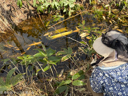 ちこ太郎と見に行ったら なんとエゾサンショウウオが卵を産みに来てた。毎年卵と幼生は見てたけど成体を見たのは初めて めっちゃかわいい。と 下から20cm近いデカいのが上がってきた。 をを〜恐竜やん!繁殖期のオスは横っ腹の皮膚がたるむとのことでこのデカいのはおっさんやな。