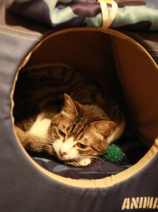 お気に入りのボールを持ち込んで寝ていました。ボールでひとり遊びを楽しんで場所を譲ったモヤモヤは解消できたもよう。