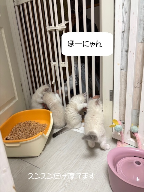 ほーにゃんが帰宅し声が聞こえると大喜びの子猫達🎵今朝の子猫達。ファンファンとツクツクは走ってます。朝早くから元気なんだよねぇ。真似したくなるお年頃の子猫達。オルくんが隅っこに行ったらツクツク、気になって仕方ない。なんとかオル兄ちゃんの所に行きたかったみたいですが途中で断念。この場所、ノンノンなら行けるんですよ。(箱の中はペットシーツが入ってるのに爪で穴だらけ💧)運動能力がここ最近飛躍的に伸びてきて遊び始めると撮影が大変(特にゾンゾン)遊び出したら止まらない男を捕まえて抱っこ(*´▽`*)落ち着いて遊んでる子達を見てます。(離すと走り出します)・‥…━━━☆・‥…━━━☆・‥…━━━☆・‥…━━━☆☆スンスン☆☆ノンノン☆☆ゾンゾン☆☆ファンファン☆☆ツクツク☆・‥…━━━☆・‥…━━━☆・‥…━━━☆・‥…━━━☆子猫達のパパ、まれっちくんは子猫達に会いたいと毎日訴えます。だけど子煩悩すぎて・・・まだ遠くで見てるだけにしてもらってます。フィナンはかなりいいお兄ちゃんになってきました♪おまけのほっぺたん。推しの撮影は忘れないシエルパパ。******************************3月3日生まれのこりゃるちゃん子達🎵オーナー様募集中です!お問い合わせはシエルリングのHPからお願いします。シエルリングHPはこちらをクリック→