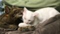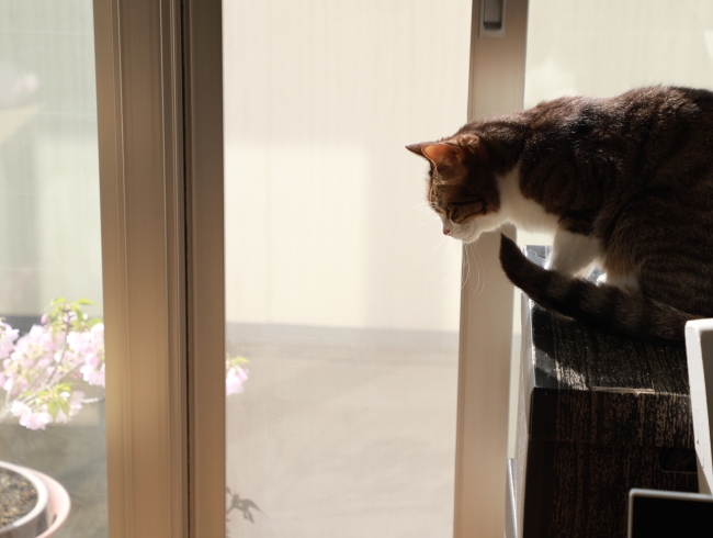 アミ姐さん。日光浴をしながらグルーミングをする様子をうっとり撮っているとカーテン裏で日光浴をしていたらしいユウが出てきてガン見。姐さんがうとうとし始めるとそろりと寄ってきてすぐ下の爪とぎソファに。ぐいぐい接近しようとすると離れてしまう姐さんですが