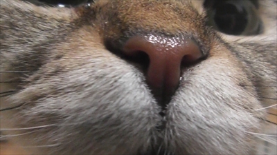 ネコさんのお鼻は湿ってる。理由の通説は、・ 匂いをキャッチしやすくなる・ ウィルスや細菌等の侵入を抑制する(例えば → こんな解説記事)乾いていると病気? と疑いたくなるが、起き抜けとか、乾き気味なこともあるとか。でも、鼻先は敏感だし急所だしで、触らせてくれない子も多いだろう。そんな時には、光を当ててみよう。こんな風に、濡れ光ってるお鼻が見られるかもしれない。見る角度には注意が必要。今回の場合、横から見たら、乾いてるように見える。う~ん、結局あまりお勧めできないか。お鼻が湿ってるかどうか、非接触で簡単に確認できる方法、何かないかな?