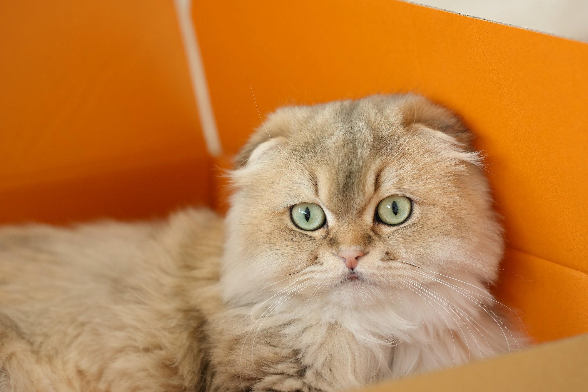 内側がくすみオレンジ色のダンボール箱。 ちょっと浅めですがレオくんにはちょうどいいサイズ感ですね。 うしろに書いてる文字は、 ルイヴィトン。 コロンママ「バッグを修理に出したらこの箱に入って帰ってきたんですよ。」 レオくん「ぼく、ルイヴィトンって初めてかも?」 コロンママ「そういえばそうかもしれませんね~。使い心地はどうですか?」 レオくん「横のふたがちょうどいいです♡」 そう言ったレオくんは箱に潜るようにコロリン。 そして左目だけ出してカメラを見るのでした。