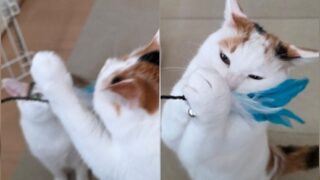 アメリカン・ショートヘア 青い羽根のつづき。 一昨日のつづき。購入した、青い羽根。やっぱり、新しい玩具は楽しそう。遊ぶシチュエーションを変えたりしてね。リリはノリノリ。ララも、リリに譲りつつも楽しそうに遊んだね。さて、それを、あめちゃまに。はい、フレーメン。そして、また陰で遊ぼうと誘っ... 2025.10.17 アメリカン・ショートヘア